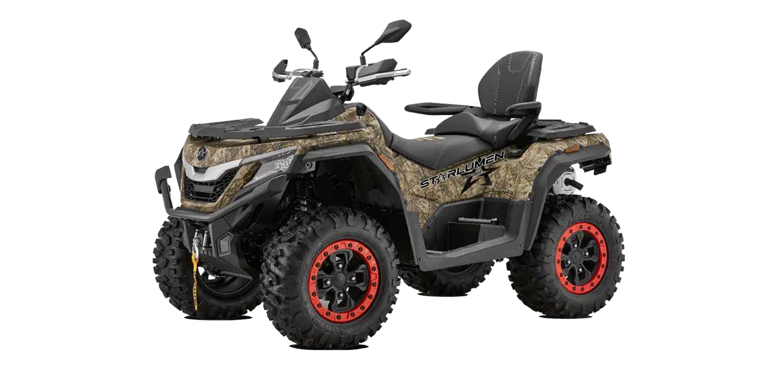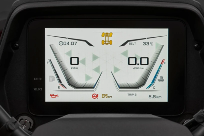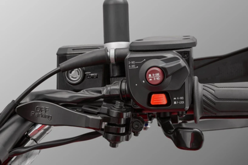 V-twin engine, CVT automatic transmission, dual high/low driving modes, front and rear adjustable differential locks